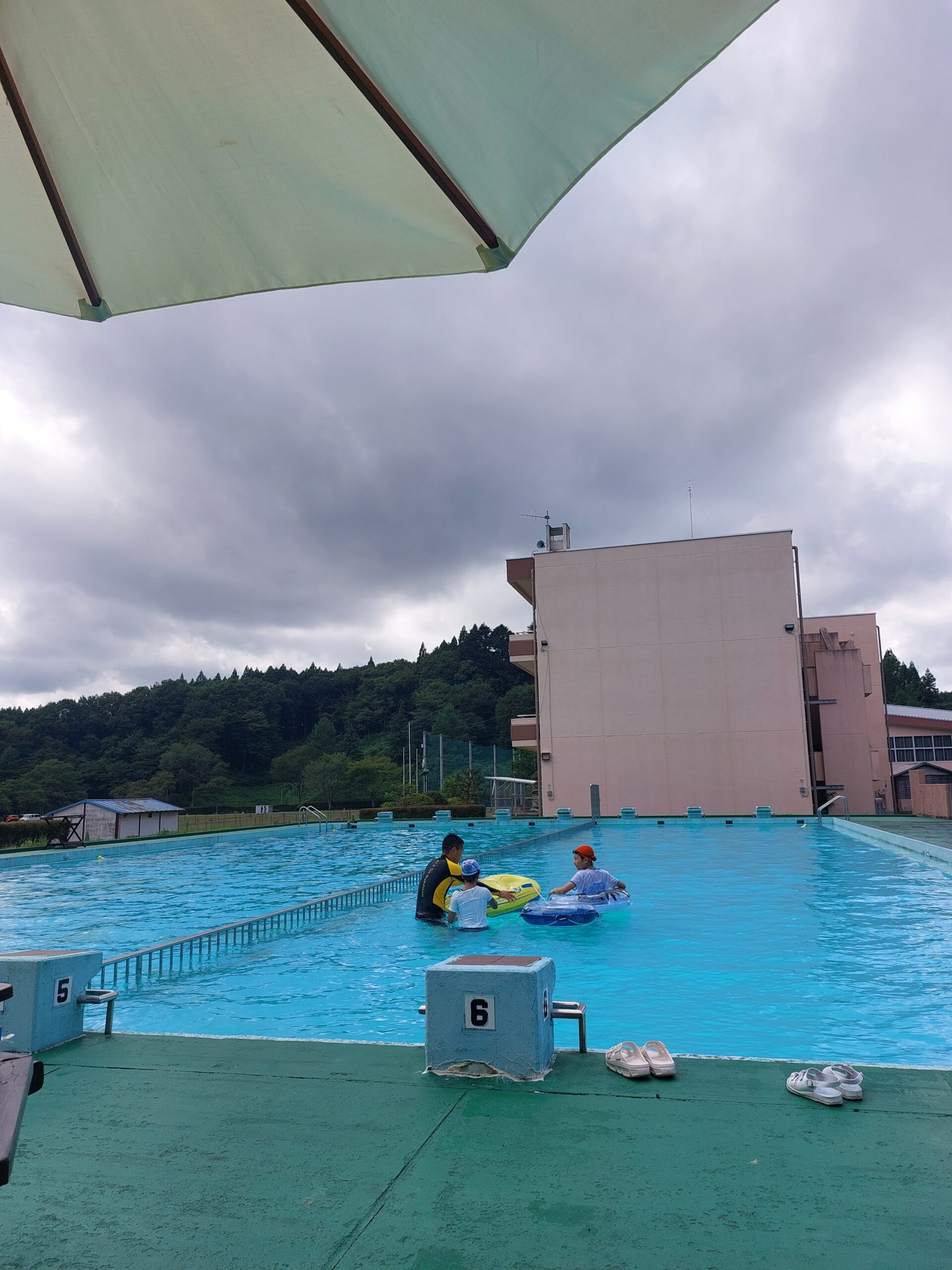 校庭がキャンプ場になってて、プールも管理されてます