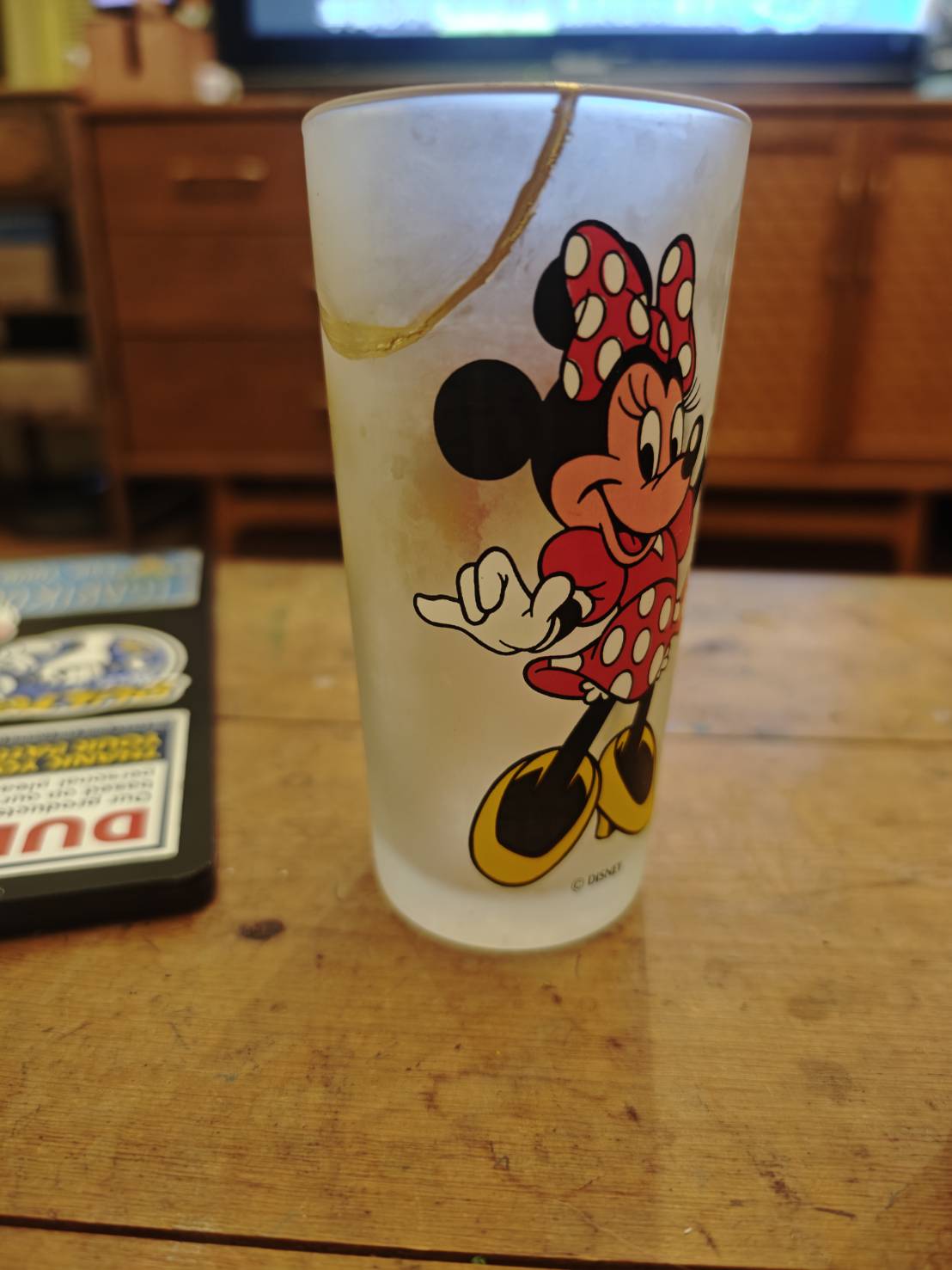このグラスは子供の時にディズニーランドで買ったミニーちゃんで、年季の入ったレアものです。笑