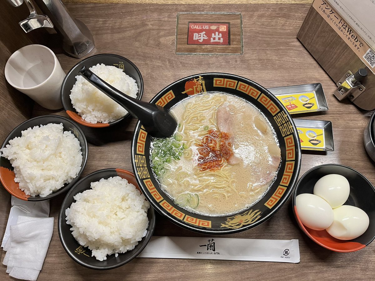 基本のラーメンに、替え玉×2、白米×3、茹で卵×3、そして赤い秘伝の粉を20倍